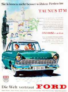Aber natürlich nicht nur im Bereich der Kleinwagen entwickelt sich die Technik unaufhörlich weiter, auch in der Mittelklasse bemüht sich die deutsche Automobilindustrie mit großem Erfolg, den stetig wachsenden Ansprüchen der Käuferschaft gerecht zu werden. Großen Werbeaufwand betreibt nach wie vor Ford, dessen endgültig veralteter „Buckeltaunus“ vom wegen eines entsprechenden Emblems auf der Motorhaube „Weltkugel“ getauften Taunus 12 M („Meisterstück“) abgelöst wird.