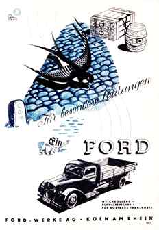 „Weichrollend – Schwalbenschnell für kostbare Transporte“ oder, Wirklichkeitsbezogener, „Stark – zuverlässig und schnell im Dienste des Wiederaufbaues“ preist beispielsweise Ford seinen langhaubigen Lkw mit 3 Tonnen Nutzlast, der wahlweise unter dem Namen „Ruhr“ mit Vierzylinder- bzw. in der Version „Rhein“ mit leistungsstarkem V8 – Motor lieferbar ist und in der Folge viele Jahre lang fester Bestandteil des bundesdeutschen Straßenbildes sein wird. Auch im PKW – Bereich fallen dem Betrachter Ford – Anzeigen angenehm ins Auge.