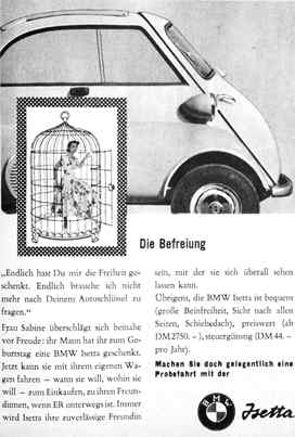 in die Verkaufsausstellungen, wo die „Knutschkugel“ mit der prägnanten, nach vorne aufzuklappenden Einstiegstür auf überaus positive Käuferresonanz stößt. In der Zeitschriftenwerbung bekundet die Isetta den beginnenden Wirtschaftswunder-Wohlstand, da sie überwiegend als Gefährt für Frauen und somit als Zweitwagen dargestellt wird. Eine Annonce aus dem Jahr 1958 dokumentiert zudem eindrucksvoll das Ende der Fünfziger vorherrschende Frauenbild. Waren die Frauen in den Nachkriegjahren vielfach auf sich allein gestellt und bewältigten die schwierigsten Situationen auch ohne die noch in Gefangenschaft befindlichen oder im Krieg gefallenen Männer, werden sie nun wieder zum treuen Anhängsel und „Heimchen am Herd“ degradiert. Zwar entsteigt in besagter Isetta-Anzeige eine frohgemute Ehefrau unter der Überschrift „Die Befreiung“ demonstrativ ihrem Käfig