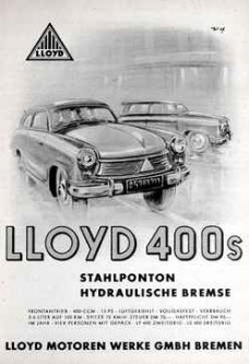 da er eine durch ein Hartholzgerippe zusammengehaltene Sperrholz-Karosserie besaß, die abschließend mit Kunstleder überzogen wurde. Weil nicht viel Fantasie dazugehört, sich auszumalen, dass eine solche Konstruktion ihren Insassen bei einem Unfall sicherlich nicht die besten Überlebenschancen bietet, musste sich der Zweitakter zudem den Spottreim „Wer den Tod nicht scheut, fährt Lloyd“ gefallenlassen. Nichtsdestotrotz entwickelte sich der LP 300, der ursprünglich „Star“ heißen sollte, zum Verkaufsschlager im unterhalb des VW-Käfers angesiedelten Preissegment. Dies ist einerseits darauf zurückzuführen, dass der damalige Käufer als Gegenwert für den Preis von 3324 DM ein zwar kleines, dennoch aber zuverlässiges und vollwertiges Auto mit Platz für die vierköpfige Durchschnittsfamilie erhielt, lag sicherlich aber auch daran , dass sich Borgward nicht auf seinen Lorbeeren ausruht, sondern unermüdliche Modellpflege betreibt. So werden 1951 Kombi- und Coupe-Versionen angeboten und rechtzeitig zur IAA im Jahre 1953 präsentiert Lloyd das stärker motorisierte Nachfolgemodell LP 400 mit einer Stahlblechkarosserie, bei der nur noch das Dach aus Kunststoff besteht. Auch die Zeitschriftenwerbung hält mit diesen Verbesserungen Schritt und kommt in einem zunehmend moderneren Gewand daher. Beschränkt sie sich anfangs noch auf die bloße Hervorhebung technischer Eigenschaften („Stahlponton, hydraulische Bremse, Vollgasfest“), werden die Werbebotschaften später in Anzeigen verpackt, die den redaktionellen Beiträgen der jeweiligen Zeitungen zum Verwechseln ähnlich sehen und sich beispielsweise in Frauenzeitschriften gezielt an die weibliche Leserschaft wenden. „Sicher, ich verstehe als Hausfrau nicht viel von technischen Dingen“, heißt es in einem entsprechenden Inserat in Constanze, „aber unser Häuschen im Grünen hat erst seinen richtigen Wert gewonnen, seit unser Vati den Lloyd gekauft hat. Über eine Stunde unseres Familienlebens schenkt uns der Wagen täglich mehr, ausgeruht und guter Laune kommt Vati abends heim, kein noch so schlechtes Wetter hält ihn auf.“ Im weiteren Verlauf des Textes wird das komplette zeitgenössische Kaufargumentationsspektrum abgehandelt: „Ehrensache, dass ich natürlich auch den Führerschein gemacht habe, schon wegen der bisher so schwierigen Besorgungen in der Stadt.“ Und zu guter Letzt ist bei den geringen Betriebskosten sogar „im kommenden Jahr die lange geplante Italienreise sicher.“ Selbst im Ausland ist der Lloyd begehrt, aber nicht nur bei Borgward, sondern auch bei den meisten anderen Herstellern „brummt“ mittlerweile das Exportgeschäft.