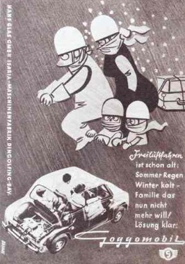 Soweit ist es hierzulande jedoch noch nicht. Ausstattungsmäßig und preislich noch unterhalb der Kleinwagenkategorie des verbesserten Lloyd angesiedelt waren „Kleinstwagen“ wie das Goggomobil und, nochmals darunter, die Kabinenroller. Letztere basierten überwiegend auf Motorradtechnik, besaßen durch ihre Karosserie jedoch einen Wetterschutz und boten in der Regel mehrere Sitzplätze. Dank der Begrenzung des Hubraums auf 250 Kubikzentimeter durften sie mit dem Motorradführerschein der Klasse 4 gefahren werden, was wohl für nicht wenige Interessenten das wichtigste Kaufargument überhaupt gewesen sein mag. Spartanisch und auf das Wesentliche beschränkt wie die Gefährte selbst präsentiert sich in der Regel auch die entsprechende Werbung.