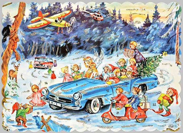 | Adventskalender aus der Wirtschaftswunderzeit: Der Weihnachtsmann kommt im Mercedes 190 daher, die Engel fahren Motorroller...