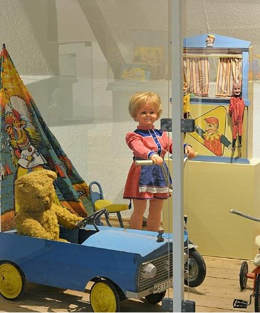|  | Kaufmannsläden …gibt es schon seit dem 17.Jahrhundert. Sie dienten ursprünglich nicht nur Spielzwecken, sondern sollten Kinder auch an den Umgang mit Geld und an die Kunst des Handelns heranführen. Wie übergroß die Bandbreite der in der DDR gefertigten Kinderkaufläden war, konnte auf dem Petersberg bereits vor einiger Zeit in einer speziellen Ausstellung zu diesem Thema entdeckt werden. – Etliche dieser Läden fanden durch Export den Weg „in den Westen“. |  | Puppenhäuser Puppenhäuser und Puppenstuben spiegeln anschaulich die Wohnkultur ihrer jeweiligen Entstehungszeit. Von der Schrankwand über den Fernseher bis hin zum Designerstuhl ist alles im Miniaturformat vertreten – es gibt nichts, was es nicht gibt. Das hier gezeigte „Haus Sonnenschein“ wurde vom VEB Grünhainichen produziert, die Püppchen stammen überwiegend von der Firma ARI (August Riedeler, Königsee) – arrangiert wurde die Szene mit einem Augenzwinckern. |  | Juniorfon Was haben die Puppe im schicken Hosenanzug aus Malimo-Kunstfaser und der Berliner Bär gemeinsam? – Beide können „sprechen“. Heute für Spielzeuge eine Selbstverständlichkeit, war das in den 1960er und auch noch 1970er Jahren durchaus etwas Besonderes. Verantwortlich dafür waren kleine Plast-Schallplatten, die über jeweils eingebaute analoge Laufwerke – oder auch mit dem „Juniorfon“ abgespielt werden konnten. |  | Papierpuppen …dokumentieren die Mode ihrer Zeit. Wer keine Bögen hatte, schnitt sich Figuren und Kleidung aus Katalogen oder Zeitschriften aus. |  | Messemännchen / Raucher-Mäcky Das für die Leipziger Herbstmesse 1964 vom Sandmännchen-Erfinder Gerhard Behrendt entworfene „Messemännchen“ war das Maskottchen dieser Veranstaltung. Ursprünglich aus Holz gefertigt, waren vor allem die späteren Exemplare aus Plaste häufig in den DDR-Kinderzimmern zu finden. – Der DDR-„Mäcky“ orientierte sich sicherlich an dem in der Bundesrepublik ausgesprochen populären „Mecki“, dem Maskottchen der Fernsehzeitschrift „HörZu“. |  | Militärisches Spielzeug „Kriegsspielzeug“ gibt es in der DDR als fröhlich buntes Sandkastenspielzeug schon für die Kleinsten zu kaufen. Aufschluss über die dahinter stehende Ideologie gibt ein Beitrag in dem Fachbuch „Spielzeug“ aus dem Jahr 1958: „Der Erwachsene hat in Bezug auf militärisches Spielzeug und vor allem den Umgang des Kindes mit solchen Gegenständen nicht nur eine sehr schwierige, sondern auch eine in hohem Grade moralische Aufgabe. Gilt es doch, Sinn und Zweck des Spielzeugs in einer einfachen, dem Kinde sofort eingängigen Form zu erläutern. Denn die Funktion des Gewehrs als Waffe, mit der man in der Lage ist, andere Menschen zu töten, ist nur ein Teil der notwendigen Erklärung, die das Kind von seinem Erzieher erhalten muss. Wenn aber das Kind erfährt, dass es böse Menschen gibt, die nur zu gerne in seinen Lebensbereich eindringen würden, dass aber diese bösen Menschen gerade über solche Waffen verfügen, dann weiß es, dass es die Waffen dann gebrauchen wird, wenn es gilt, seine Heimat gegen solche Eindringlinge zu verteidigen." |  | Gesellschaftsspiele Obwohl sie sehr viel Spielspaß versprechen, führen traditionelle Gesellschaftsspiele im Zeitalter digitaler Unterhaltungselektronik leider nur noch ein Schattendasein. - Vielleicht lässt sich ja der eine oder andere Besucher dieser Ausstellung durch den Anblick der in dieser Vitrine gezeigten DDR-Klassiker dazu animieren, einmal wieder die alte Spielesammlung hervorzuholen und einen PC- und fernsehfreien Abend einzulegen… |  | Halma Die beiden Spiele aus den Jahren 1950 bzw. 1982 dokumentieren durch ihre aussagekräftigen Deckelbilder mit zeitgenössischen Familienbildern anschaulich die gesellschaftlichen Entwicklungen. |  | Kugelspiele Spiele dieser Art finden heute nur noch am PC oder auf dem Smartphone statt. Ob das eine besser war als das andere, mag jeder für sich selbst entscheiden. |  | Murmeln und Kreisel Stundenlangen Spielspass ganz ohne Technik boten Murmeln (auch Märbel, Klicker, Knicker, Marbeln, Schusser etc. genannt) und Kreisel. Die „Peitschenkreisel“ wurden durch eine herumgewickelte und schnell weggezogene Peitschenschnur in Rotation versetzt und konnten durch geschickte Peitschenschläge lange in Bewegung gehalten werden. |
