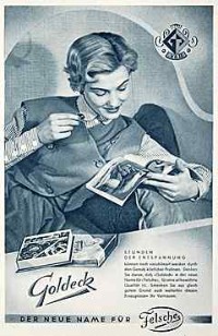 | | "Goldeck - der neue Name für Felsche" (Anm.: 1953 wurde die Firma W. Felsche zum VEB Goldeck verstaatlicht.) | | "Schmerz laß nach", Werbeschild (schätzungsweise um 1955) | | "Pflegt die Zähne mit Chlorodont morgens und abends" |