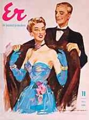 So modern und aufgeschlossen sich „Er“ über weite Strecken präsentiert mag: wenn es um die Stellung der Frau geht, die nach Umstände bedingter Selbstständigkeit in den Kriegs- und Nachkriegsjahren nun wieder an den Herd zurückgeholt werden soll, zeigt man sich, zumindest zu Beginn der 50er, noch überwiegend konservativ. Im Artikel „Welche Frauen werden begehrt? Ein aktuelles Problem“ erfährt frau in einer für heutiges Empfinden sicherlich unfreiwillig komisch klingenden Wortwahl, was von ihr erwartet wird: „Eine kluge Ehefrau wird ihren Mann immer nett empfangen, ihn nicht gleich beim Heimkommen mit häuslichem Ärger überfallen, sondern vielmehr versuchen, durch ein nettes Kleid und freundliches Lachen frohen Willkommensgruß zu bieten.“ Steigerung gefällig? „Wohl alle Männer sind sich darin einig: Eine Frau darf nicht eifersüchtig sein. Es schadet dagegen nichts, wenn Sie hin und wieder um die Treue des Ehegatten bangt.“ Und als Höhepunkt: „Frauen müssen sich gut kleiden, ohne Extravaganzen zu lieben. Wir lieben ihre Natürlichkeit. Sie sollen nicht unbedingt klug sein, aber das Herz am rechten Fleck haben.“ Nochmals bekräftigt wird diese männliche Sichtweise der Verhältnisse in der Abteilung „Herrenwitz“, die von Beginn an auf einer und später sogar zwei eigenen Seiten fester Bestandteil des Hefts ist. „Man weiß, dass er es in sich hat.“ Dennoch „ist der Herrenwitz niemals zotig. Er hasst aufdringlichen Lärm, krakeelendes Lachen und wiehernde Begeisterung und man kann ihn getrost „gerade noch“ in jeder Damengesellschaft erzählen, sofern man nicht grundsätzlich derartige Dinge als groben Verstoß gegen die gesellschaftlichen Sitten verwirft.“ Endlich erfährt der Leser auch, was denn nun den Mann zum Herrn macht: „Die innerliche und äußerliche Haltung, das Bestreben, Manieren zu zeigen und die einwandfreie charakterliche Einstellung zu den Dingen des Lebens.“ Ein gepflegtes Äußeres allein ist kein untrügliches Merkmal. „Wichtiger als eine elegante Garderobe scheint Lebensart und Korrektheit namentlich im Umgang mit Frauen. Daran – und nur daran erkennt man der wirklichen Herrn.“