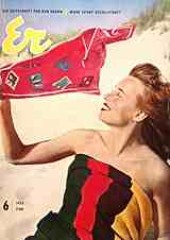 Mit Heft 4/53 wechseln wieder einmal Redaktion und Herausgeber. Letzterer ist nunmehr mit Claus Wessel, dem Verleger der Lübecker Nachrichten, ein Mann der „ersten Nachkriegsstunde“. Zudem taucht zwischen den mittlerweile üblichen Fotocovers mit Ausgabe 5/53 erstmals auch wieder ein gezeichnetes auf, das zugleich die Liste der Er-Titelbildkünstler um einen illustren Namen erweitert: Kurt Heiligenstaedt gehört, wie ein entsprechender Begleittext nicht ohne Stolz verkündet, „noch zu den Könnern des heute fast schon sagenhaft gewordenen Simplicissimus-Kreises.“ Damit nicht genug war Heiligenstaedt auch für die legendäre „Weiße Dame“ verantwortlich, die ab den 20er Jahren für fast vier Jahrzehnte die Werbung des Waschmittels Persil maßgeblich prägte. Im selben Heft findet noch eine weitere Premiere statt: Erstmals ist in „der Zeitschrift des Herrn“ eine Seite mit Damenmode zu entdecken. Da es sich dabei jedoch ausschließlich um von weiblichen Fotomodellen präsentierte Bademode handelt („Für junge, grazile, sportlich orientierte Damen ist dieses Modell besonders attraktiv“), liegt die Vermutung nahe, dass diese Seite vielleicht doch vorrangig den Herrn „informieren“ soll.