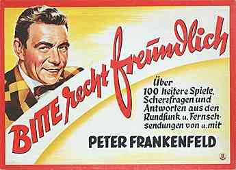 | Waren Frage- und Antwortspiele schon lange vor Eintritt in das Fernseh-Zeitalter Bestandteil der Lieferprogramme vieler Gesellschaftsspiel-Hersteller, versuchten diese nun Mitte der 50er Jahre zusätzlich von der rasch wachsenden Popularität der neuen Bildschirmstars zu profitieren. So stellt z.B. die Firma Franz Schmidt 1956 weniger den Inhalt der Neuheit "Bitte recht freundlich" zur Fernsehshow selbigen Titels in den Mittelpunkt ihrer Werbung im Fachorgan "Das Spielzeug", als vielmehr den zugkräftigen und werbewirksamen Namen deren Moderators. "Über 100 heitere Spiele, Scherzfragen und Antworten aus den Rundfunk- und Fernsehsendungen mit Peter Frankenfeld" heißt es dort, der Name des Entertainers ist in dreifacher Größe der Artikelbeschreibung abgedruckt und sein Konterfei dominiert natürlich ebenso den Verkaufskarton. Beim Spiel selber geht es um die Beantwortung unterschiedlichster Fragen. Wer nicht weiß, warum "viele Vertreter flache Nasen" haben (weil ihnen soviele Türen vor der Nase zugeschlagen werden), kann diese Wissenslücke in der Folge dadurch kompensieren, daß er beispielsweise dreimal hintereinander ohne Versprecher "Kraut bleibt Kraut und Brautkleid bleibt Brautkleid" aufsagt oder mit verbundenen Augen einen im Zimmer befindlichen aufgeblasenen Luftballon findet... Bekleidet mit seinem zu einer Art Markenzeichen gewordenen großkarierten Jackett führte er ab 1954 durch eine Vielzahl von Fernsehshows.  | "Bitte recht freundlich" - Peter Frankenfeld (1956)
