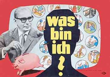 | Bereits 1955 war der "Quiz-Meister" Robert Lembke mit seinem heiteren Beruferaten "Was bin ich?" erstmals Gast in bundesdeutschen Wohnstuben und wäre es, wenn nicht 1989 verstorben, wahrscheinlich noch bis zum heutigen Tag. Mittlerweile legendär sind sein "Welches Schweinderl hätten's denn gern?" ebenso wie die mit Formulierungen in der Art von "Gehe ich recht in der Annahme, daß...?" beginnenden Frageungetüme seines Rateteams. Die Regeln des mit Plastik-Sparschwein und Fünf-Mark-Stücken aus Holz ausgestatteten Spieles des Herstellers Noris entsprechen denen des Fernsehvorbildes : durch richtige Interpretation einer typischen Handbewegung sowie vor allem durch geschickte Fragen, welche ausschließlich mit Ja oder Nein beantwortet werden dürfen, ist ein Beruf herauszufinden - in der Sendung repräsentiert durch einen Studiokandidaten, im Gesellschaftsspiel vorgegeben durch anschaulich illustrierte Kärtchen mit Tätigkeitsbezeichnungen wie Schutzmann, Schlotfeger oder Mannequin. Wenn alle mitgelieferten Beschäftigungen erraten sind, kann man "die Spielmöglichkeiten ganz beträchtlich erweitern" und den "lang ersehnten neuen Satz von 20 Berufekarten" über den Fachhandel bestellen, eine zusätzliche Einnahmequelle, die sich auch andere Hersteller in der Regel nicht entgehen liessen.  | "Was bin ich?" - Robert Lembke