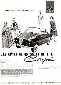 | | | Goggomobil - "Der erste eigene Wagen gehört zu den eindrucksvollsten Ereignissen im Leben einer Frau. Er bringt die langersehnte Unabhängigkeit, man gebietet über Zeit und Raum, ist frei und doch geborgen." (1959)