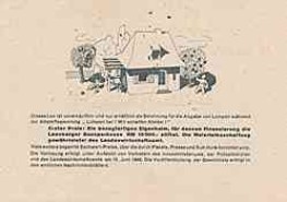 | | "Dieses Los ist unverkäuflich und nur erhältlich als Belohnung für die Abgabe von Lumpen während der Altstoffsammlung "Lumpen her! Wir schaffen Kleider!" - Erster Preis: Ein bezugsfertiges Eigenheim, für dessen Finanzierung die Leonberger Bausparkasse RM 1000.- stiftet. Die Materialbeschaffung gewährleistet das Landeswirtschaftsamt."