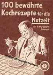 100 bewährte Kochrezepte für die Notzeit Aus dem Inhalt: "Kochen ist eine Kunst, in Notzeiten besonders. Vieles hängt von der Zubereitung ab, auch ohne üppige Zutaten läßt sich noch ein schmackhaftes Gericht bereiten. (...) Auch die Küchentechnik muß jetzt geändert werden. Braten in Fett verbietet der Fettmangel. (...) Statt Zucker verwenden wir an vielen Stellen etwas feingeriebene Zuckerrübe, auch den Preßrückstand aus der Rübensaftherstellung." – Rezepte z.B.: "Wildkrautsuppe", "Brennesselmus", "Rote Rüben wie Rotkraut", "Rüben wie Bayrisches Kraut", "Runkelrüben-Eintopf", "Klößchen aus Kartoffelschalen", "Kartoffeltorte", "Bienenstich aus Erbsen", "Marmelade von grünen Tomaten und Falläpfeln", "Vogelbeergelee", "Kaffeeaufstrich mit Zuckerrüben", "Falsche Leberwurst", "Falsche Mettwurst", "Sparkäse", Falscher Krokant"