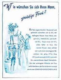 "Wie wünschen Sie sich Ihren Mann, gnädige Frau?" "Ein Test ergab kürzlich: Humorvoll und geistreich wünschten sich je 4% ihren Mann, elegant 5%, ritterlich 8% und kraftvoll 9%. Treue stand mit 11% schon höher im Kurs. Die meisten Frauen aber sehnten sich nach einem überlegenen Beschützer, der gütig (17%), klug (19%) und vorsorglich (23%) sein soll. Ein unerreichbares Ideal? Keinesfalls: Die drei wichtigsten Wünsche der Frau erfüllt der Mann, der für die Seinen vorsorgt, durch eine LEBENSVERSICHERUNG."