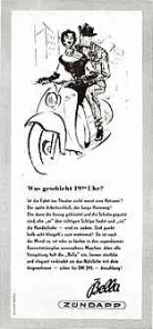 | | ZÜNDAPP BELLA - "Was geschieht 19:20 Uhr? Ist die Fahrt ins Theater nicht meist eine Hetzerei? (...) Aber alle Verspätung holt die "Bella" ein. Immer startklar und elegant verbindet sie das Nützliche mit dem Angenehmen."