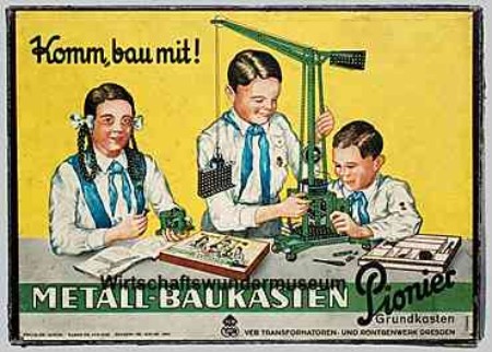 "Komm, bau mit!" - Metall-Baukasten Pionier - Grundkasten, Hersteller: VEB Transformatoren- und Röntgenwerk Dresden (1955)