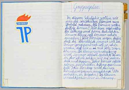 "Gruppenplan: In diesem Schuljahr wollen wir uns die sowjetischen Pioniere zum Vorbild nehmen. Alle Pioniere wollen fleißig lernen! Wir lesen regelmäßig die Zeitung und hören Nachrichten. Unsere Klasse soll immer schön aussehen! Wir Pioniere sorgen dafür, daß die Wandleiste immer voll ist. Unser Gruppenbuch soll so schön werden, daß wir es mit Stolz zeigen können. Die Klassenwandzeitung wird immer aktuell gestaltet! Bei uns in der Schule achten wir auf Sauberkeit und Hygiene. Jeder Pionier erfüllt seinen persönlichen Auftrag gewissenhaft! Jeden Montag wird das neue Fernsehprogramm ausgehängt. Wir arbeiten in Brigaden! Die Klasse versucht, immer in Ordnung, Disziplin und bei der Anfertigung der Hausaufgaben 5 Punkte zu erreichen. Die Blumen werden ordentlich gepflegt. Wir nehmen alle regelmäßig an den Gruppennachmittagen teil. An Sammlungen, Spendenaktionen und der Weihnachtspatenaktion beteiligen wir uns. - Einige Gruppennachmittage: Aktuelle Themen, Bastelnachmittag, Zeichennachmittag, Badbesuch, Schallplattennachmittag, Lesenachmittag." - Aus dem "Gruppenbuch" einer "Klasse 3", Schuljahr 1974/75