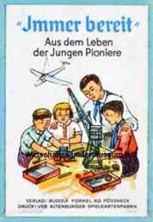 | Zeit im Bild - Titel: "Eltern, denkt an uns, stimmt mit JA!" - Themen z.B.: "Verbot der Volksbefragung isoliert Adenauer und seine Clique", "Wachsender Wohlstand - Erfolge friedlicher Aufbauarbeit", "Verarmendes Westdeutschland" (1951) | | Für die Heimat - "Eine Sammlung von Kurzgeschichten, die von patriotischen Taten Junger Pioniere berichten" (1952) |