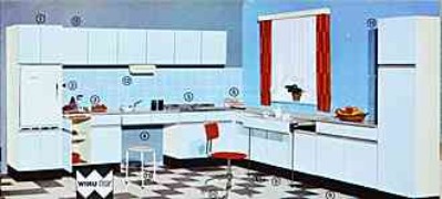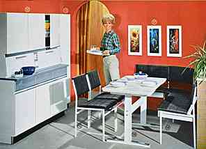 | |  | | "Es ist ganz gleich, ob Sie diese Küche in den bunten Pastelltönen wählen oder in elfenbein. Ein ganz besonderer Vorteil - die gesamte Küche ist innen und außen vollständig in Kunststoff gearbeitet. Es erfordert wenig Mühe, die Küche innen wie außen vollständig sauber zu halten." (1960) | | "Die Küchen von heute und morgen...Zeit- und raumsparend - dann ist die Küche die ideale Werkstatt der Hausfrau." (1960) |