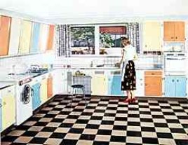 | | "Frohe Farben - frohe Arbeit" - "Die ganze Familie freut sich. (...) Die appetitlich saubere Tischplatte aus Kunststoff ersetzt das althergebrachte hölzerne Knetbrett. Und dann die Kunststoffplatten auch auf Arbeitsflächen und Fußboden, mit denen Farbe wirksam in den Raum eingezogen ist und gute Laune verbreitet." (1958) |