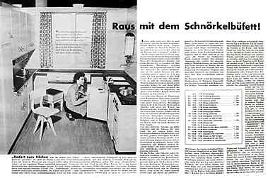 | | "Raus mit dem Schnörkelbüfett! - "Ändert eure Küchen und ihr ändert euer Leben" - dieses amerikanische Schlagwort ist jetzt auch ein deutsches geworden. Es steht auf Punkt 1 auf dem Umerziehungsprogramm, mit dem moderne westzonale Wohnspezialisten die deutsche Hausfrau von einigen lieben alten Küchengewohnheiten abbringen wollen." Zeitschriftenbericht (1952) |