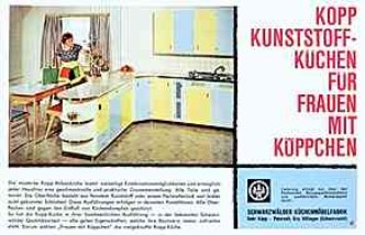 | | | | "In der Siematic-Küche kochen Sie mit Vergnügen, denn die vielen technischen Neuerungen erleichtern Ihre Arbeit und werden Sie begeistern: durchlaufende Griffleisten, selbstschließende Matic-Türen ohne Schloß und Schnäpper, Verstellmechanik zur individuellen Innenausstattung, Elektroleiste für Stromversorgung an jedem Arbeitsplatz." (1960) | | Kopp Kunststoff-Küchen "für Frauen mit Köppchen"- "Die Oberfläche besteht aus feinstem Kunststoff oder einem Perlmutterlack von bisher nicht gekannter Schönheit." (1960) |