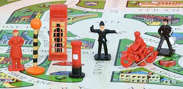 | Geschicklichkeitsspiele der Firma Perma, mit denen per unter der Spielfläche befindlichem Magnet Fahrzeuge zwischen diversen Hindernissen hindurch manövriert werden konnten, erfreuten such in den 50er und 60er Jahren nicht nur bei Kindern in Deutschland-West großer Beliebtheit. Weiter unten ein entsprechendes Spiel aus DDR-Produktion, darunter ein wunderschön illustriertes aus England. |