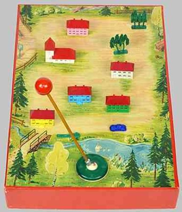 Nachtrag: Mann, was hab' ich mir seinerzeit einen abgebrochen, die Funktionsweise dieses Spieles einigermaßen verständlich zu formulieren...Jetzt fand ich in einem zeitgenössischen Fachbuch eine Beschreibung des Spiels, die zudem noch zusätzliche weiterführende Informationen beinhaltet und die ich deshalb hier komplett zitiere: "Auf der Leipziger Herbstmesse 1955 zeigte die Firma Eberhard Päßler, Dresden, ein neues Geschicklichkeitsspiel, mit dem sich (...) das Kind längere Zeit beschäftigen kann. Das "Permo-Spiel" heißt so als Abkürzung für Perpetuum mobile. Das Spiel ist auf dem Prinzip der schiefen Ebene aufgebaut und besteht aus zwei Böden. Die obere Platte kann nach allen Seiten geneigt werden, das Auto setzt sich in Bewegung und muß nun durch das Lenkrad so geschickt gesteuert werden, daß es die Hindernisse umfährt. Erschweren kann man das Spiel, wenn außer den Häusern noch Verkehrsschilder angebracht sind, die der Spieler beachten muß, zum Beispiel Einbahnstraße usw. Dieses Spiel kann aber nicht nur als Einzelspiel verwendet werden. Dann wird ein nicht fahrbares Auto an die Stelle gesetzt, wo der Spieler die Spielregel verletzt hatte. Der nächste lenkt weiter." Aus: "Schriftenreihe Elternhaus und Schule - Spielzeug für mein Kind."