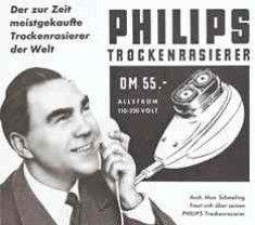 | |  | |  | | Electro-As GmbH, Werbung für die Küchenmaschine Piccolo mit "Fernsehkoch" Clemens Wilmenrod (um 1956) | | Electro-As GmbH - "Gesundheit durch Frischsaft! Max Schmeling und seine Frau Anny Ondra luden uns zu einer Frischsaft-Cocktail-Party ein." (um 1956) | | "Auch Max Schmeling freut sich über seinen Philips-Trockenrasierer" (1955) |
