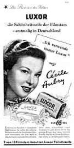 | |  | "TEXAS Virginia's" - Lale Andersen: "Eine von den Besten die ich je geraucht habe!" (1950) | | TEXAS, Ilse Werner (1951) | | "Die Premiere des Jahres - LUXOR die Schönheitsseife der Filmstars - erstmalig in Deutschland, Cécile Aubry" (1951)