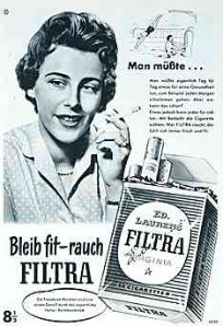 Etwas jedoch kann jeder für sich tun: Mit Bedacht die Cigarette wählen. Wer FILTRA raucht, der fühlt sich immer frisch und fit." - "Bleib fit - rauch FILTRA"" (1955)