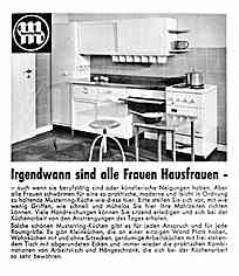 "Das weiß auch "er", der fröhliche Herr des Hauses, wenn er einen Blick in "ihr" Reich, die Küche, tut. Wie flink geht ihr in ihrer modernen Küche die Arbeit von der Hand, ob bei der Zubereitung der Mahlzeiten, ob beim Spülen oder Putzen." - Aus einer Werbung für "Musterring"-Möbel (1956)
