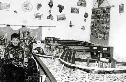| Einen Gegenpol zu den "Carrerabahnen" bot das "Auto Motor Sport"-System der Firma Faller ("Faller AMS"). Während Carrera reine "Rennbahnen" anbot, konnte man mit den Faller-Bahnen auch den Stadtverkehr (inklusive Kreuzungen!) nachspielen. - "Ich besaß als Kind eine von meinen Eltern gebastelte (mein Vater baute die Bahnen zusammen und war für die Verkabelung verantwortlich, während meine Mutter die Gebäude-Bausätze zusammenklebte) "elektrische Autobahn" von Faller (gemeinsam auf derselben Platte gebaut mit einer "Alwegbahn" der Firma Schuco, ein Jahr später kam sogar noch eine Märklin-Eisenbahn dazu) und fand diese (siehe unten) einfach nur großartig! - Beim Anblick des Weihnachten 1966 entstandenen Fotos kommt mir heute im Rückblick der Ausdruck "stolz wie Oskar" in den Sinn..."