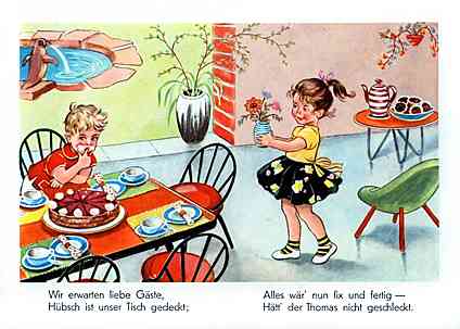 |  | ...und wird in diesem wunderschön illustrierten Kinderbuch im allerschönsten 50er-Jahre-Ambiente - inklusive Nierentisch und Tütenlampe - empfangen: "Wir erwarten liebe Gäste, Hübsch ist unser Tisch gedeckt; Alles wär' nun fix und fertig - Hätt' der Thomas nicht geschleckt."