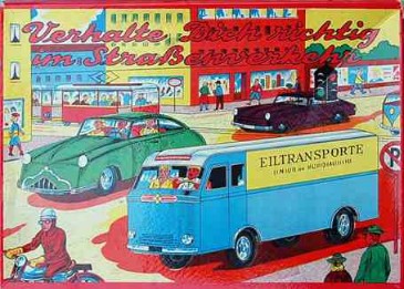 Verkersspiele aus der DDR  | |  | | "Autofahrt für alle" | | |  | "Gute Fahrt, ein lehrreiches Verkehrsspiel mit veränderlichen Verkehrszeichen, Lichtern und Posten, für 2-4 Spieler, mit kleinen Autos aus Plaste, 4.-", Artikelbeschreibung aus dem Katalog Frühjahr-Sommer 1963 des Versandhaus Leipzig
