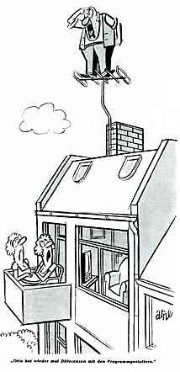 | "Wie geht es Euch, wir haben lange nichts von einander gehört hier ist noch alles wohl auf, nur das Wetter ist nicht so, wie man es um diese Jahreszeit so gewohnt ist. Ich sitze am Fernseher & sehe Familie Hesselbach ist ja blöd.", Ansichtskarte (1960) | | "Otto hat wieder mal Differenzen mit den Programmgestaltern." - Witzzeichnung (1959) |