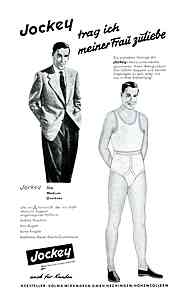 | |  | "Jockey - feeling ist das Plus an Lebensfreude, das imponierende Gefühl überlegener Sicherheit - bedingt durch straffen Sitz und echten "masculine comfort"" (1958) | | "Benger Ribana Herren - Unterwäsche - die Herrenwäsche unserer Zeit" - "scheuerfester, besser denn je!" (1958)
