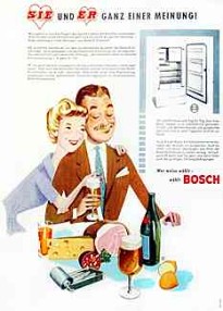 | |  | | | | Bosch - "Bunt wie das Leben sind unsere Wünsche...Der eine möchte nach Italien, der andere möchte einen Wagen, aber fast alle, die einen Haushalt haben, wünschen sich einen BOSCH-Kühlschrank" | | Bosch Kühlschrank - "SIE und ER ganz einer Meinung"