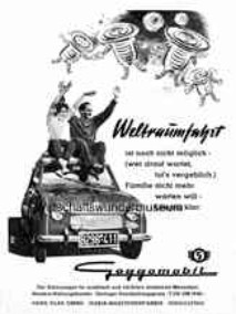 | | Fichtel & Sachs AG Schweinfurt - "Auch dagewesen mit Sachs-Motor, Lotte und Kurt" | | "Weltraumfahrt ist noch nicht möglich - (wer drauf wartet, tut's vergeblich.) Familie nicht mehr warten will - Lösung klar: Goggomobil" |