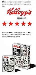 | | "Milch macht schön" | | "Kellog's Corn Flakes und Rice Krispies stets tischbereit, ergeben mit Milch und Zucker ein delikates Frühstück. Sie sind im Handumdrehen serviert." |