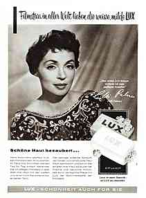 | | "Filmstars in aller Welt lieben die weisse, milde LUX", Lilli Palmer | | "Die moderne Frau" - "Camelia gibt allen Frauen Sicherheit und Selbstvertrauen" | | "Ständige Stimmungsschwankungen, innere Unsicherheit und und körperliche Schwierigkeiten belasten die Beziehung zu Familie und Umwelt. Diese Hemmnisse zu überwinden, brauchen gerade junge Mädchen in den Pubertätsjahren Faruengold." |