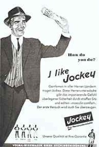 | | | | "Das Männerideal von heute - Früher imponierte der saloppe Naturbursche, heute der korrekte Herr. - Der modische Hut ist wieder der i-Punkt des gepflegten Mannes. - Frauen sehen uns lieber mit Hut!" | | Jockey Herrenunterwäsche - "How do you do? I like Jockey - Gentlemen in aller Herren Länder tragen Jockey (...) Sicherheit durch straffen Sitz und echten "masculin comfort"" | | |