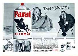 | |  | Paral AUTOMAT - "Diese Motten! Der schöne teure Mantel! Mit anderen Woll- und Wintersachen, mit Pelzen, Teppichen, Polstermöbeln kann's Ihnen ebenso ergehen. Motten kennen kein Erbarmen! - 1-2-3 mottenfrei durch PARAL"