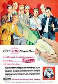 | | "...nimm doch Philips" | | "Eine helle Sensation das Allzweck-Handlicht aus jeder Steckdose... AccuLux mit magischem Auge" | | Telefunken-Fernseher - "Die Brücke zur Welt" |