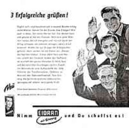 "Nimm Eidran und Du schaffst es!" "Wer auch in dieser Zeit starke Nerven hat, klar denken kann und gesund ist, hat alle Chancen. Weit ist er jenen Männern voraus, die sich energielos und mürrisch durch den Alltag schleppen, die jedesmal versagen, wenn's drauf ankommt. Wollen Sie zur Gruppe der Erfolgreichen gehören, dann werden Sie mit Eidran ein "Meister des täglichen Lebens". (...) Glutamin intensiviert den Gehirnstoffwechsel, Sam Ginseng, die berühmte asiatische Lebensverlängerungswurzel schenkt verjüngende Kraft."