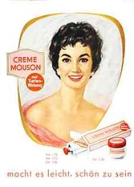 | |  | |  | | "Das Reisefieber krümmt kein Haar - BIO DOP Frisiercreme - die Vollendung der Frisur" | | Mouson - "Die kosmetische Versicherung - Vor dem Älterwerden schützt Sie keine Versicherung - Vor dem Älteraussehen bewahrt Sie jedoch die Trajana Placenta-Tricomplex Hautcreme" | | 4711 TOSCA - "Das sympathische Gesicht lebt!"