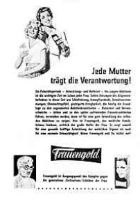 "Jede Mutter trägt die Verantwortung!" "Die Pubertätsperiode - Entwicklungs- und Reifezeit - des jungen Mädchens ist die wichtigste Zeit im Leben jeder Frau. Sollen Störungen des Allgemeinbefindens in dieser Zeit wie Schlafstörung, Krampfzustände, Gemütsverstimmungen, Ohnmachtsgefühl, gesteigerte Erregbarkeit, die häufig die Grundlage zu den sogenannten Mädchenkrankheiten - Blutarmut und Nervenschwäche - bilden und zu den später auftretenden Frauenkrankheiten führen, vermieden werden, dann ist für eine gute Entwicklung des reifenden Mädchens zu sorgen. Hier ist Frauengold, das weibliche Konstitutions-Tonikum, wirklich der große Helfer der Frau. Es sorgt sowohl für eine gesunde kräftige Entwicklung der weiblichen Organe als auch für eine normale Drüsentätigkeit. Nimm Frauengold und Du blühst auf!" - Zeitschriftenwerbung (Anm.: Frauengold enthielt mind. 16,5% Alkohol)
