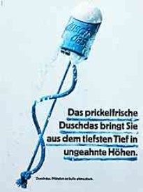 | |  | | | | Duschdas - "Plötzlich ist Seife altmodisch." | | "Seife passé - Shampoo adé. Jetzt gibt es Doppeldusch vom Kopf bis zum Zeh." | |