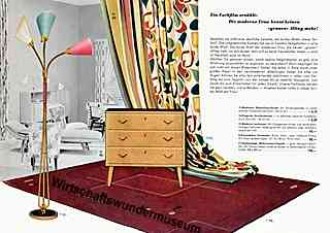 Trotz aller Werbeanstrengungen ist es vielen Ratgeber-Redakteuren 1956 aber offenbar immer noch nicht bunt genug. „Haben Sie Mut zur Farbe!“, fordert die Zeitschrift Constanze ihre Leser/innen auf, nachdem ein „namhafter Farbenspezialist“ behauptet hat, dass „in Deutschland mehr Beige als Grundton an die Wände gepinselt oder als Tapete geklebt wird, wie von allen anderen Farben zusammen. Die Menschen haben keinen Mut zur Farbe!“ Und so hat der Constanze-Fachmann „für alle Wohnlustigen – für jedes Temperament und jeden Geschmack - Beispiele bereit“ und präsentiert einen Raum in verschiedenen modernen, für heutiges Geschmacksempfinden jedoch – gelinde gesagt - sehr ungewöhnlichen Farbkombinationen wie beispielsweise braun, türkis und rosa. In einer als „lebhaft und lustig“ betitelten „Komposition“ sind im abgebildeten Zimmerausschnitt gar acht verschiedene Farben auszumachen, auf „drei Farben allein an Wänden und Decke“ bringt es eine als „eigenwillig und heiter“ eingestufte Zusammenstellung. Zum Schluss des Beitrags bekommt der verantwortliche Constanze-Redakteur jedoch scheinbar Angst vor der eigenen Courage: „Sie brauchen den Mut zur Farbe ja nicht gleich an der größten Wand erproben und auch nicht an dem teuersten Sessel. Man kann mit den Wänden des Flurs beginnen oder mit einer einfarbigen Tischdecke im Wohnzimmer….“ Insgesamt aber sind die Bundesbürger mittlerweile neuen Trends gegenüber aufgeschlossener geworden, denn mit stetig steigendem Wirtschaftswunderwohlstand und gestiegenen Konsumbedürfnissen ist die Zeit reif für Veränderungen nach innen wie nach außen. „Schöner wohnen besser leben“ ist ein häufig gehörtes Motto. „Die Zeit bleibt nicht stehen. Ein neuer Geist drückt sich in unserem Wohnen aus. Die Technik hat auch das Wohnbedürfnis reformiert. Helle, Einfachheit, äußerste Zweckmäßigkeit, klare Form und Farbigkeit bestimmen das Bild der heutigen Wohnung.“ „Das plumpe Plüschsofa wurde ersetzt durch eine leichte elegante Couch mit farbenfrohen Bezügen.“ Solche größenmäßigen Reduzierungen haben aber nicht nur geschmackliche Gründe, denn in Folge der durch die Kriegszerstörungen entstandenen Wohnungsnot ist die durchschnittliche Grundfläche der Zimmer beträchtlich gesunken. Aber eine „geschickte Einrichtung macht alles möglich, und Du glaubst nicht, wie viel Platz man findet, wenn man wenig Raum braucht!...Nur nicht zu viel Möbeln, Gerätschaften…“. Was klingt, wie einem Einrichtungsratgeber der 50er Jahre entnommen, ist bereits in Goethes „Wilhelm Meisters Lehrjahre“ nachzulesen und zu dieser Zeit aktueller denn je. „Moderne Wohnkultur ist kein Luxus“, weiß auch die Zeitschrift „Das Schönste“, der gehetzte Mensch von heute braucht die beruhigende und zugleich anregende Atmosphäre lichter, freundlicher Farben und zart belebter Muster, einfach gefälliger Möbel und anschmiegsam weicher Stoffe, wenn er in seinem Heim Entspannung finden und seine strapazierten Nerven regenerieren will. Alles Schwere und Lastende, Muffige und Beengende, das den mehr der Repräsentation dienenden Räumen früherer Zeiten anhaftete, ist heute verpönt.“