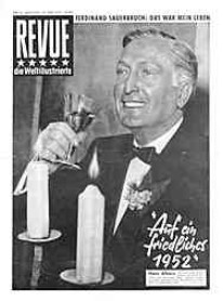 | | Revue - die Weltillustrierte - Titel: "Es gibt wieder Liebe - Nach der Zeit der Enttäuschungen und Entbehrungen, die die Kriegs- und Nachkriegsjugend hart und verbittert gemacht hatte, neigen die jungen Menschen heute wieder mehr zu innigen Gefühlen und geben sich gerne einer schwärmerischen, romantisch betonten Liebe hin." | | Revue - die Weltillustrierte - Titel: Prinz Juan Carlos von Spanien: "Morgen ist er König" - Weitere Themen: "REVUE-Aktion zur Vermittlung elternloser Kinder", "Die Wagners von Bayreuth" |