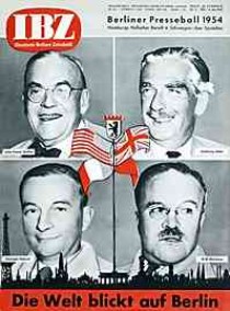 | | IBZ - Illustrierte Berliner Zeitschrift - Titelthema: "Die Welt blickt auf Berlin - Berlin vor der Viererkonferenz" Titelbild, im Uhrzeigersinn: John Foster Dulles, Anthony Eden, Georges Bidault, W.M. Molotow" - Weitere Themen z.B.: "Hellsehen - unter der Lupe der Wissenschaft", "Die vier ersten Flugkapitäne der Deutschen Lufthansa werden in England ausgebildet"