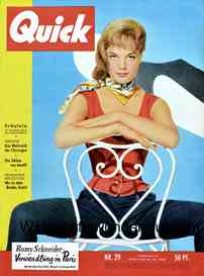 | | Weltbild - Titel: "Ihre Majestät Sissi III. - Romy Schneider als junge Elisabeth von Österreich wurde schon zweimal zu einem ungeahnten Erfolg an in- und ausländischen Kinokassen. Jetzt tritt Sissi zum drittenmal in majestätsicher Pracht als charmante Kaiserin vor ihr Publikum." | | Quick - Titel: "Romy Schneider - Verwandlung in Paris" - Themen z.B.: "Das Wunder "Halla"", "Ein Atomkern zerbirst" |